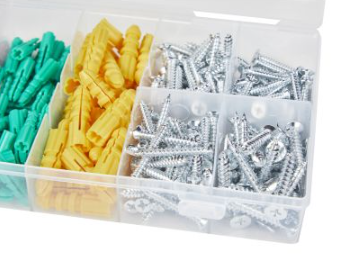 285 PCE Assorted Anchor And Metal Screw Set Specially designed for porous or brittle walls that would not normally support weight with a screw alone. Includes carrying case for quick and convenient storage. Contains 285 assorted wall anchors and metal screws.Specially designed for porous or brittle walls that would not normally support weight with a screw aloneIncludes carrying case for quick and convenient storageContains 285 assorted wall anchors and metal screwsPackage ContentsWall Anchors: No. 6 x 1" (x35), No. 8 x 1" (x40), No. 8 x 1-1/4" (x40) & No. 10 x 1-1/4" (27). Metal screws: No. 6 x 1" (x35), No. 8 x 1" (x40), No. 8 x 1-1/4" (x40) & No. 10 x 1-1/4" (x28)