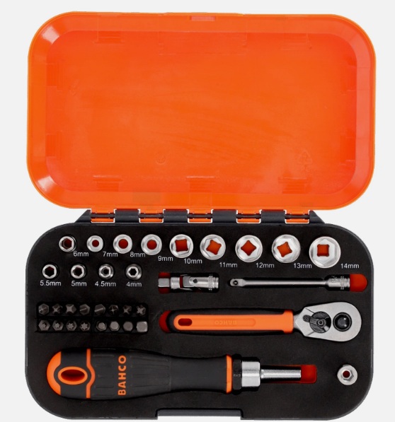 Bahco Socket And Bit Set 34 Piece 1/4" Square Drive Metric Hex Profile Model: S34MC8H13no. 1/4" drive sockets; 4mm 4.5mm 5mm 5.5mm 6mm 7mm 8mm 9mm 10mm 11mm 12mm 13mm 14mm1no. 1/4" short ratchet with quick release1no. 1/4" universal joint1no. 1/4" bit holder for 1/4" hex shank drive bits1no. 1/4" x 75mm extension bar1no. ratcheting handle bit holder3no. Phillips drive bits; PH1, PH2, PH32no. Flat drive bits; SL4, SL5.53no. Pozi drive bits; PZ1, PZ2, PZ33no. Hex drive bits; H4, H5, H64no. Torx drivebits; T10, T15, T20, T251no. adaptor 1/4" male square to 1/4" male hexagonMicro Matte finishHigh-performance 50BV30 alloyed steel