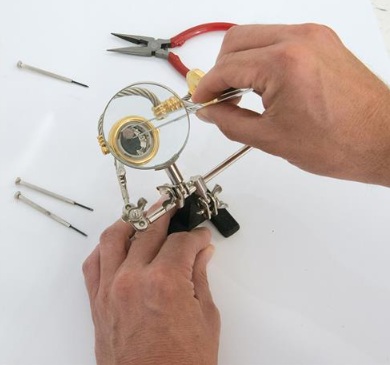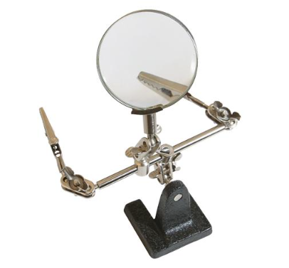 HELPING HANDS Holds objects securely for precision workCrocodile clips hold workpieceHeavyweight base for stabilityAdjustable ball & socket joints with wing nuts remain in set positionH x L x W: 170 x 185 x 49mmVersatile device for holding work in a fixed position during assembly, soldering or painting. For model making, electronics and crafts. Includes 2 fully adjustable arms with croc clips and heavy duty base for stability. Lens 63mm 2.5x. H x L x W: 170 x 185 x 49mm. Weight 0.3kg.