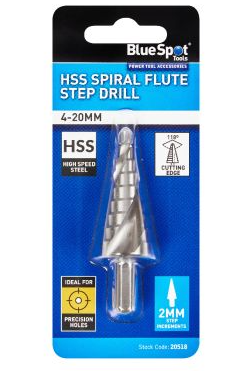 HSS Spiral Flute Step Drill (4-20MM) is ideal for precision drilling in aluminium, brass, copper, plastic, steel and wood.
