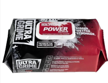 UltraGrime 5920 Power Scrub Wipes - Pack of 80. ULTRAGRIME Power Scrub is seriously powerful as it take out stubborn, ground-in grease, dirt and grime with ease. Ultragrom PRO Power Scrub cloth wipes have a rough textured side for extra tough stains and dirt. ULTRGRIME 5920 cleaning wipes are safe on hands and brutal on dirt.ULTRAGRIME Wipes are Double the size of standard wipes 38cm x 25cmTOUGH ON DIRT:- A dual-sided and abrasive heavy-duty scrubbing side and also smooth side for polishingSuper thick material and very absorbentStays wet outside of the packet for 60 minutesUltragrime wipes will not dry out even if the lid or seal of the pack is left openDermatologically tested